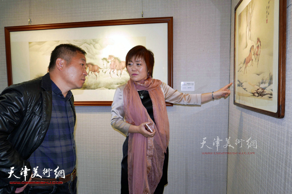 李澜与天津文化产业协会会长曹秀荣在展览现场观看作品。