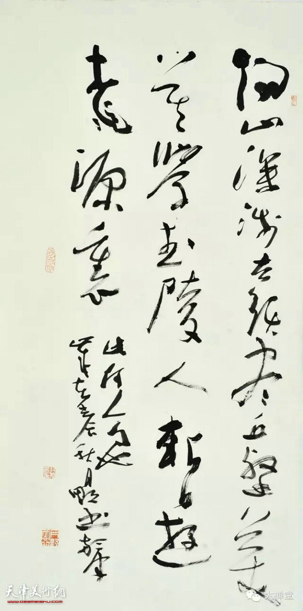 尹沧海教授的绘画纵横恣纵,气象万千,其以奇取胜的写意画其实也是建立在规矩法度、功力基础之上的,无非这个规矩法则不同于规整画的造型原则,这个功力也不同于规整画的造型功力,而更在相对独立于形象之外的笔墨的规矩法则、笔墨的功力。尹沧海教授最有艺术代表性的是具有雄辩力量的书法的线条,最能体现儒道释的美学意蕴的“水墨清华”气象,辅之以最能体现人文灵魂的诗文,铸就了笔塑其型,以水为气,以墨丰其韵,以诗显其魂的“禅宗大写意” 绘画。