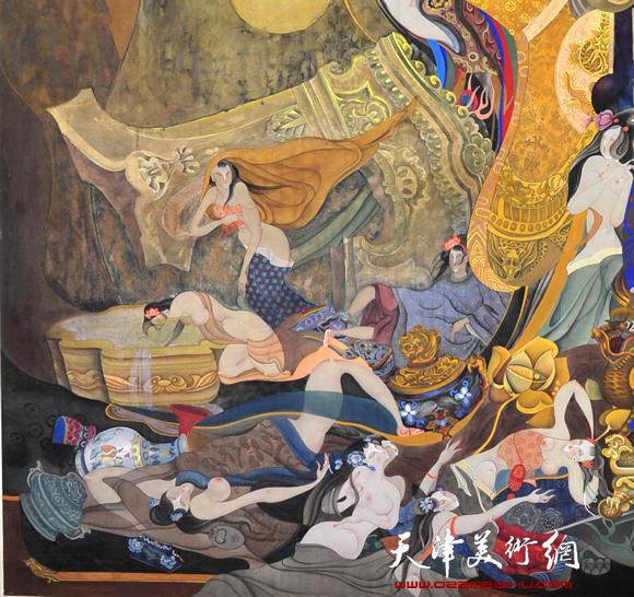 [李寅虎]:对。第一是反映了这个题材,从历史背景讲这幅画因为六世班禅觐见乾隆,给乾隆皇帝拜寿。第二,佛在人们的艺术当中就是威严、庄严和博大的,在这样的前提下对人们形成了一定带有震慑力的这种感知。所以最后选定的班禅的形象以及整个的场景都是尽力表现人们的这种感知,使观众能更好的理解这幅画。当然我们还要强调主题特征,也就是藏传佛教的特征结合汉人的理解,只有这种对题材完美的理解才能带给大家视觉和心灵的震撼,当然每个人有不同的理解方式。我在画的时候也带着这种尊重、敬仰的心态和梦幻的理念最终描画出来了这样的造型特征。