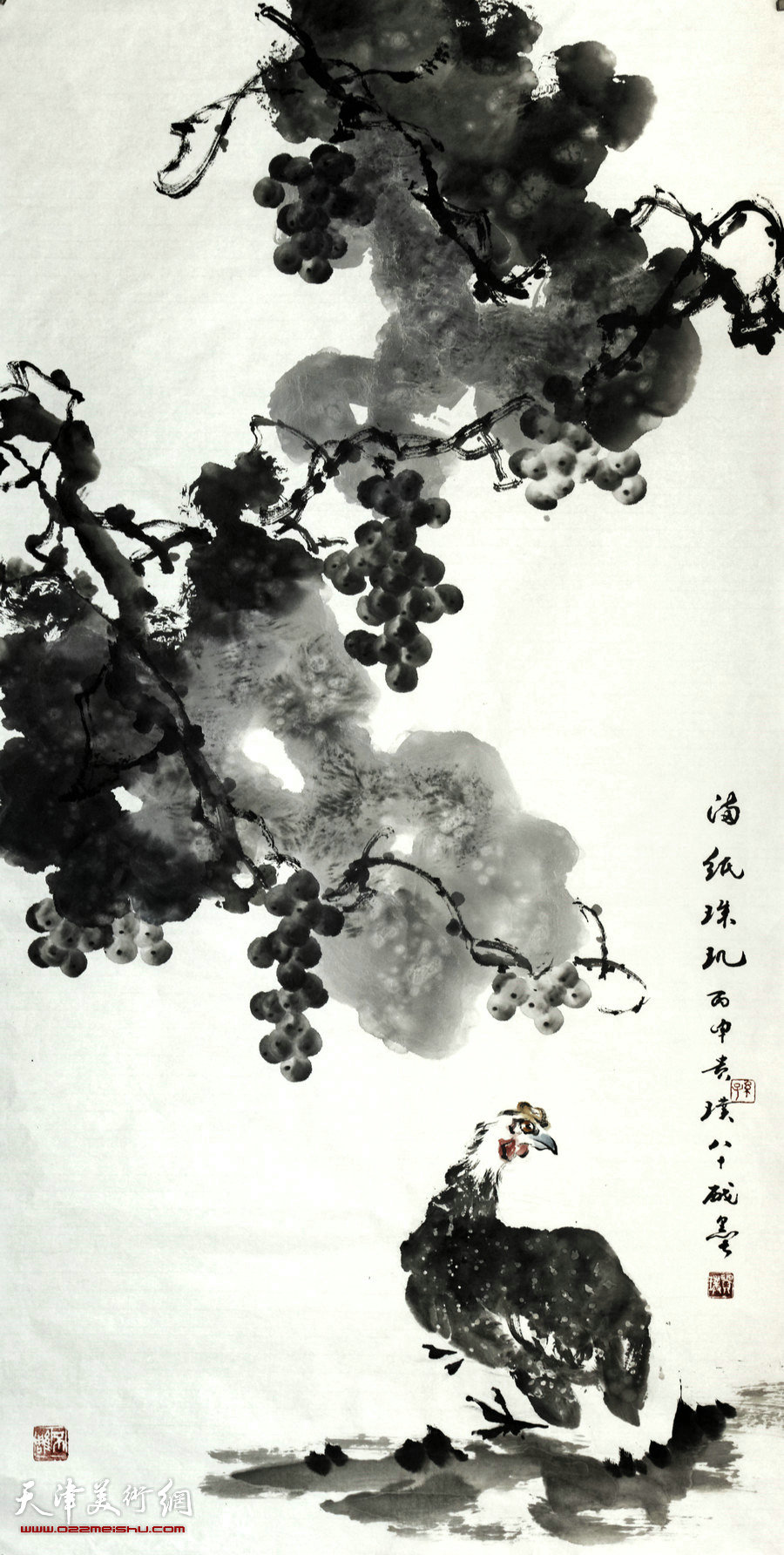 他的很多画表现了对生活、对生命的深沉爱恋。《雨中晴》画的是雨中葡萄架的一角。饱吸雨水的叫子低垂着,透出惬意的酣足。两只小鸟飞着嬉戏,是在唱久早遇甘霖的欢歌吗?没有体验,没有真情实感,画不出这样富于生活气息和艺术情调的作品。