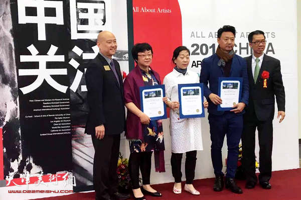 赵美心向主办单位中西方美术研究院、美国国际交流协会颁发了贺状,加州众议员周本立向做出贡献的艺术家魏传中、杨洁、牛照辉颁发了贺状。圣盖博市长廖钦和向中西方美术研究院院长余润德、杰出艺术家姜溪女士、盛世雅韵国际文化传媒总裁张明颁发了贺状。蒙市副市长梁侨汉向参展艺术家们颁发了参展证书。此次活动得到了帕萨迪纳市、蒙特利公园市、圣盖博市的大力支持。