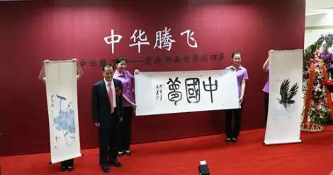 君寿先生在开幕式上讲述,在他50年艺术生涯中,唯独钟爱《中华腾飞图》这副作品,并以此作品名做主题目。“我被鹰的勇敢精神深深吸引,我把雄鹰长空、万里江山融为一体,借以表达中华民族不掘不挠的顽强、拼搏精神!在我的“画道”中始终以追求中华诗情入画,从早年继承皇家宫廷画法、慢慢吸收海外油画色彩到开创中西合壁的艺术风格,一直以来都被鹰的精神所鼓舞,不断尝试创新发展!我想我会一直坚持下去!”