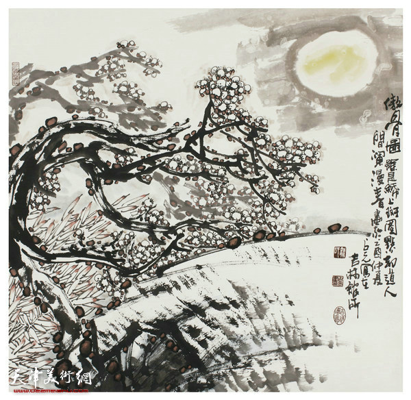 姚占元,原涿州市美术家协会主席,现任涿州画院院长,保定画院顾问,中日民间文化交流协会理事,国家一级美术师。姚占元先生画写意花鸟,兼画山水、人物,其中最擅长白梅。他的画植根于传统笔墨,用笔老道、苍厚。多年来,他重点研习梅花题材的创作,突出线的表现力,通过梅花枝干间的扭曲咬合来表现力量感。看他的冷艳白梅,设色清纯高雅,层次丰富厚重,构图密满奇险。一株株白梅于画中,或聚或散,寒香傲雪,仿佛这一株株白仙儿要夺框而出。精气神儿饱满又不失稳重,简而不浮,繁而不乱,让观者置身于大雪中,士人旁,白梅下,甚是开怀。