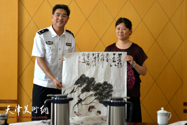 天津市青少年发展青基会书画院院长石伟向天津监狱管理局赠送作品。