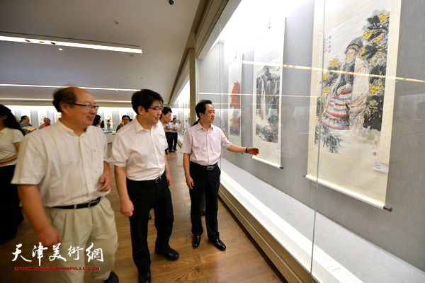 杨金海、梦玉、王宝贵、钱钢等陪同嘉宾在书画展现场。
