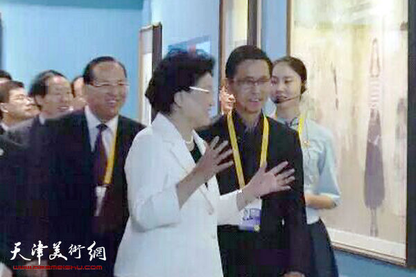 国务院副总理刘延东率首届敦煌文博会与会国内外嘉宾观赏“敦煌精神”何家英特展。