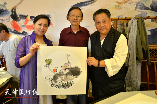 津门名家金秋笔会现场。图为罗名道长、吕立、杨进步。