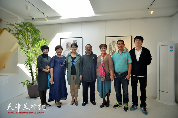 姚海峰夫妇、阎妍、刘冬梅与来宾在画展现场。