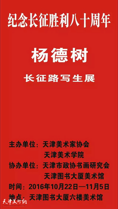 天津美术网讯 为纪念长征胜利八十周年,由天津市美术家协会、天津美术学院联合主办,天津市政协书画研究会、天津图书大厦书天艺苑美术馆协办的“纪念长征胜利八十周年-杨德树长征路写生展”将于10月22日在天津图书大厦书天艺苑美术馆开展。
