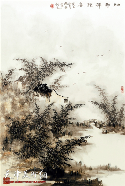 如今的刘振江先生已经成为了天津中青年画家中的翘楚,他的作品既追前贤之艺术风范,又以自己独特的山水感悟与艺术视角,通过雄浑雅致的笔墨表现力,将自己心中之山川江河,艺术地再现出来,既符合当代审美之取向,又不失中国传统之艺术精神。他的作品师法自然、心象合一,其中所透视出的哲理、心象、意境、构图以及笔墨画风的变化,也让人们感受到其山水画作之新精彩将不再遥远。