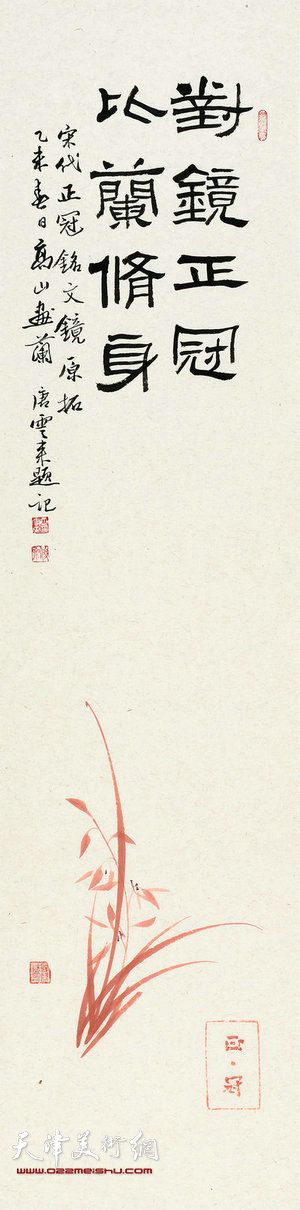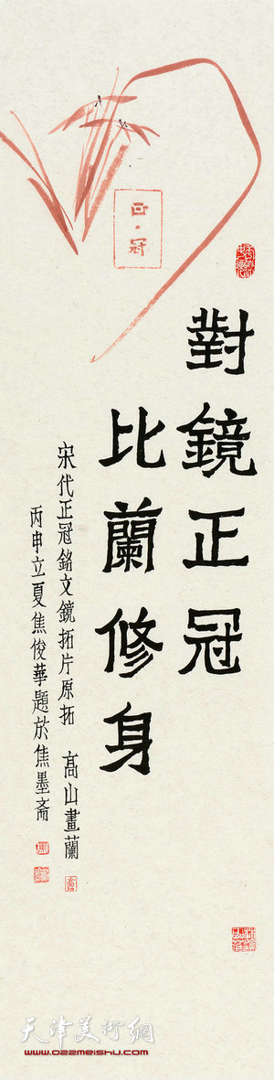天津美术网讯 由天津港保税区社会发展局、天津港保税区党建工作部、市纪委驻保税区纪检组、天津空港经济区文化中心、天津美术学院联合主办的“2016《正冠﹒修身﹒进行时》高山画兰﹒书画名家题词邀请展”将于11月18日下午2:30在天津空港经济区文化中心综合展厅开幕。展览共展出150余幅作品。《正冠﹒修身﹒进行时》高山画兰﹒书画名家题词邀请展今年已是第二年,由天津美术学院高山老师在宋代“正冠”铭文镜拓片上画兰,众多艺术家和文化名人题词“对镜正冠,比兰修身”,共同创作。作品形式新颖,传播了当代中国的价值观念,体现中华文化精神、反映中国人审美追求,是集思想性、艺术性、观赏性有机统一的优秀作品。