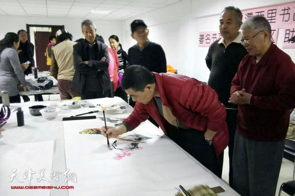 活动中,各位书画家和三潭西书画苑的学院畅谈创作感想,交流笔法技艺,并现场挥毫泼墨,将高雅艺术送到了居民的家门口。五位书画艺术家合作献艺,集体创作,短短几分钟的时间,雄鸡、牡丹、骏马、冬梅便活灵活现的跃然纸上,令在场的社区书画爱好者大开眼界。