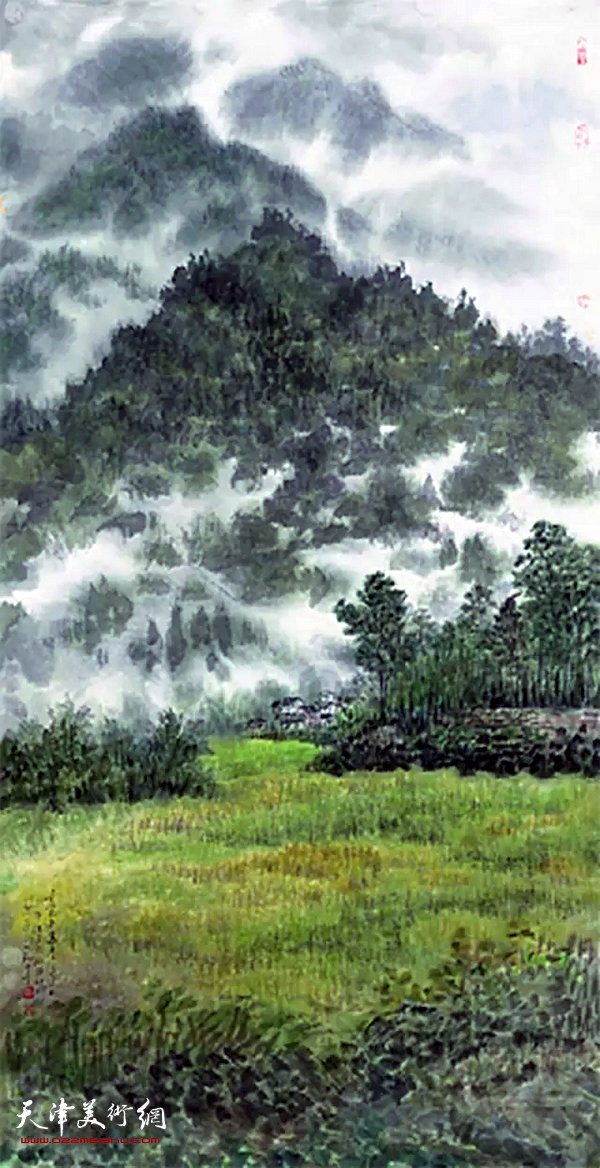 李翔的山水画,笔法灵动,笔调抒情,堪比乡土散文。通过他的笔,我们看到了这样的图景:山雨初霁,草木葱茏,一片雾气不知从何处悄然飘来,林壑瞬间变得朦胧迷离而幽深;初春时节,柔和的阳光透过云层洒落下来,照亮了山野间果树零星绽放的花朵;凉爽的秋风拂过山坡上零星散布的田块,收割后的庄稼地显得疲惫而安详,而空中似乎弥漫着一股草叶的清香……徜徉在这样的画作前,观者会感到一股清新的气息扑人眉宇。