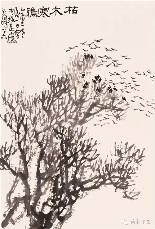 先生长于书法,功力深厚,尤善篆书、隶书与草书。对于书法与绘画的关系,先生有着十分深刻的理解,并在自己的绘画中有意加以探索。书法各体中,草书、行书与小写意绘画的关系最为紧密,先生也特别注意将草书、行书笔意运用于创作之中,以充分发挥中国绘画的书写性,使其作品更加韵味深厚。用行书笔意写出的枝干流美鲜活,生动多姿;而用草书笔意书写出的作品则苍劲浑茫。先生十分认可古人书画同源的观点,认为书法可以入画,画也可以入书法,运用得当,二者可以相得益彰。先生曾撰写了一部著作,专门探讨书法与绘画的关系问题,还绘制了很多示意图。只是这部书稿至今尚未发表。先生曾经说,自己画枯枝从临摹古人开始,有了一定的基础之后再从师造化上下功夫,用笔则是从书法得来。师古人与师造化让自己打下了坚实的造型基础,良好的书法功底又使自己有条件探求画树的笔墨,因此可以毫不费力地用草法或楷法来画树枝。先生又说自己80岁前都在用楷法作画,80岁以后真正开始“自作主张”,就近于古人所说的“中得心源”了。