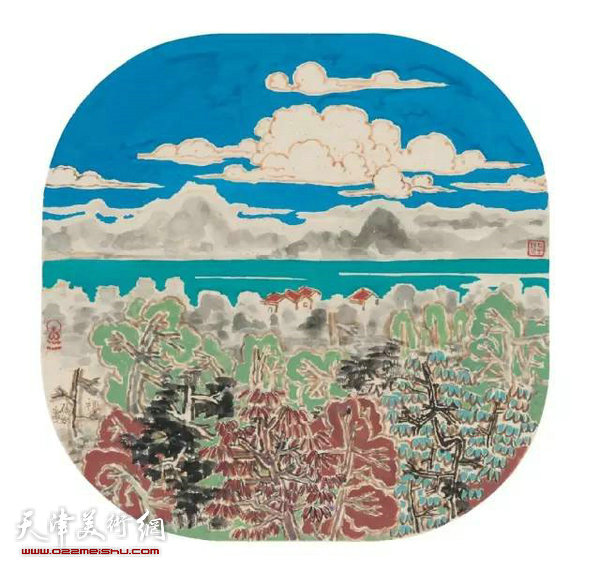 阚传好的《青山绿水》组画,突破人们对山水画的或云雾苍茫、层峦叠嶂,亦或萧冷气清、孤傲简淡的固有认识,取而代之的是碧翠的湖,湛蓝无尘的天这样的身边之景;舍弃传统大青绿山水的富丽浓郁、严谨繁复,用信手拈来的轻巧,带给观者温文淡然、轻松愉悦的审美感受。