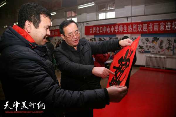 天津美术网讯 书画进校园,翰墨迎新年。今天(12月30日),“三实学堂”书画家王惠民、彭英科、李根友,河西区美术家协会秘书长郑爱民,以及画家刘士忠、杨长曙走进西青区大寺镇大芦北口中心小学,为小学生们讲授中华传统书画艺术。并现场挥毫创作,喜迎2017丁酉新年的到来。大寺镇教委主任王志杰、“三实学堂”郑宏伟、大芦北口村委会主任孙连奎、大芦北口中心小学校长朱云芳、德育主任杨金萍等,以及广大师生参加了此次活动。