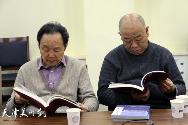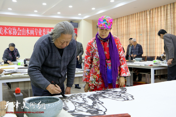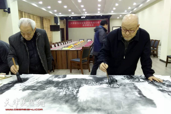 会议结束后,津门山水画界老中青三代画家欢聚一堂,相互交流、切磋技艺,挥毫创作、喜迎新春。
