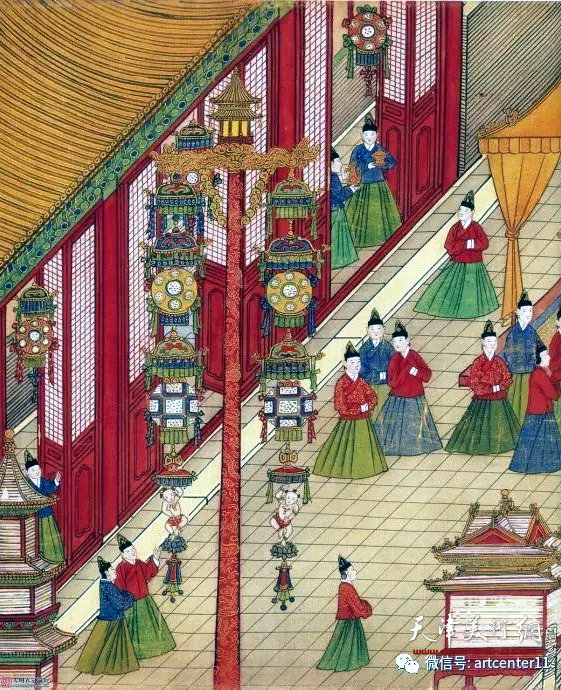 同时期的《明宪宗元宵行乐图卷》则以严谨的构图和细腻的笔法,描绘了明朝成化年间皇宫内外张灯结彩过元宵节的各种情景,每幅场景都有宪宗皇帝在场,他穿着不同的盛装,或站,或坐,表情安详,在欣赏着元宵节的各种活动。明朝过元宵节还特别规定,从正月初八上灯到正月十七落灯,要一连张灯十夜,是中国历史上最长的灯节。正月十五元宵节,更是把赏灯的气氛推向高潮。