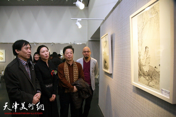 孙瑜、于栋华、黄雅丽、张俊、王霞、李悦等在画展现场观看作品。
