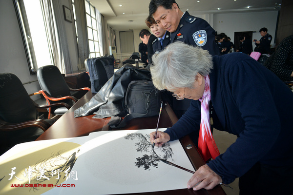 中国京津书画院院长王家树向工作在这里的女警察致以节日问候。