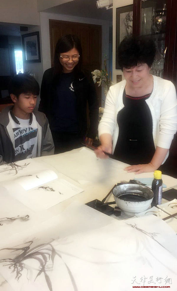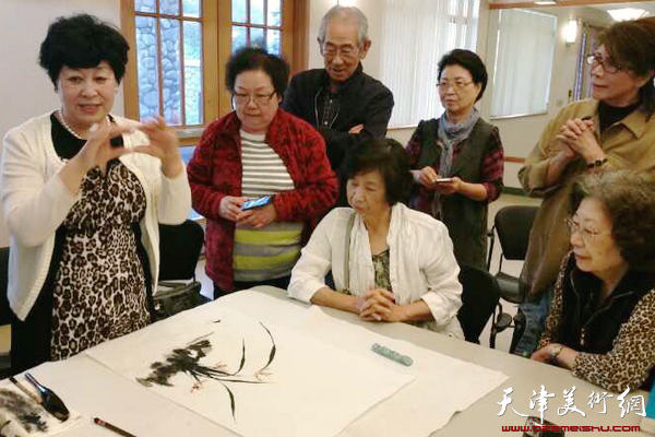 天津美术网讯 著名女画家爱新觉罗·梦玉受美国中华民族文化艺术研究中心邀请,日前赴美讲课,受到美国洛杉矶拉帕马市松柏文化中心广大学生的欢迎。爱新觉罗·梦玉为其讲授中国水墨画技法和传统的中国宫廷绘画艺术讲座,引起广大学生的兴趣,得到学生们的高度赞扬。