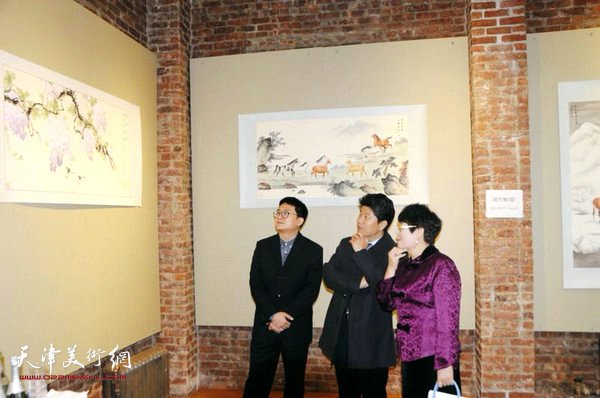 梦玉、伯骧陪同李立言观赏展出的画作。