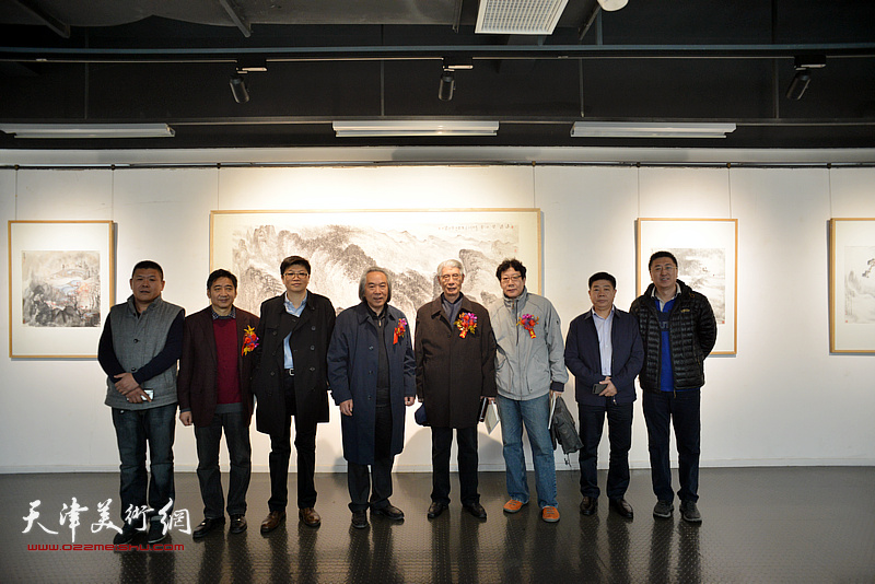 左起:晏平、贾广健、杨德树、李旭飞、邓国源、霍春阳、史振岭在画展现场。