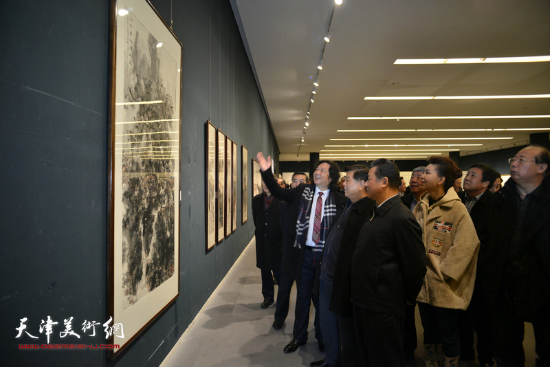 韩必省陪同胡振民、刘长喜在画展现场观看作品。