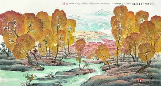 在画面构图上,引入版画的整体感和泾渭分明的块面结构促成华拓山水画具有现代审美的意趣和取向,更加贴近当代观画者的欣赏习惯和审美需求。这恰恰契合“新金陵画派”对时代风尚的敏锐把握与创新诉求。这里面有钱松喦、亚明等前辈对华拓的深刻影响,但更多的是华拓在山水画创新上的胆识:他把有唐以来的传统“泼墨”、中国传统山水画“青绿和金碧”、版画艺术以及张大千泼彩技巧等等艺术资源整合起来,融会贯通而自出新意的形成极具现代审美趣味的色彩体块张力,塑造出具有中国气派、民族特征兼具浓郁生活气息和自然情趣的山水图景。