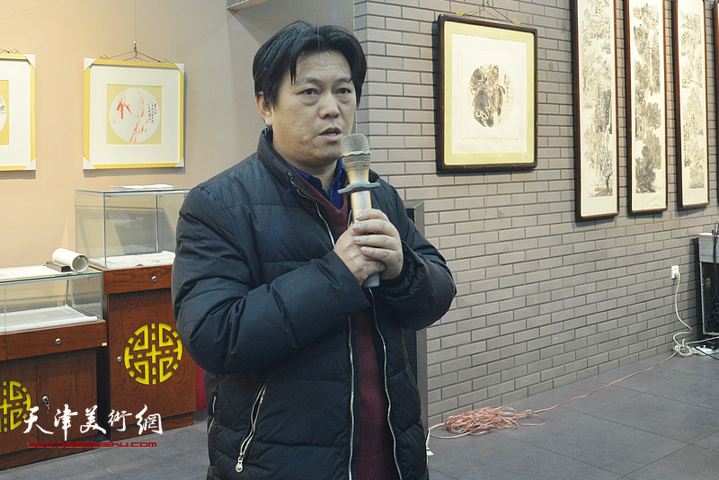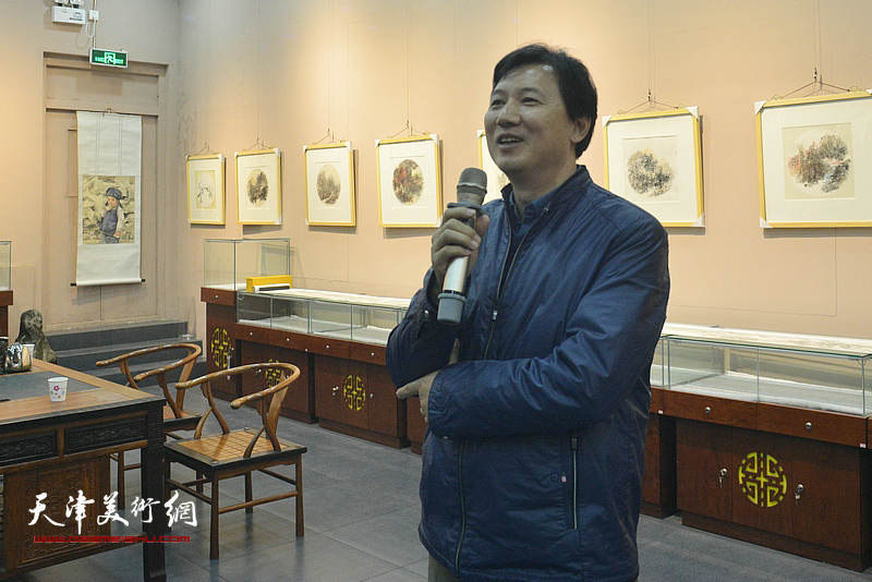 沧州雨来轩画院院长周凡在画展现场与来宾交流。