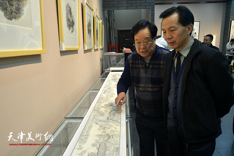丁玉来、黄克敬在画展现场观赏展出的画作。
