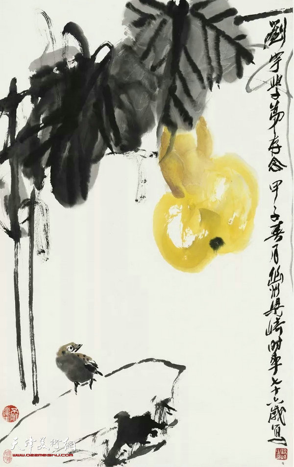 梁崎的山水画最先得益于清代四僧,尤以石涛着力为甚。石涛的山水画纵横苍莽,个性鲜明,笔法造境意趣多变,从梁崎的很多作品中都能看到石涛对他的影响。同时亦染指八大、髠残,旁涉沈石田、文衡山,终对元代诸家用情最深。他致力于黄子久,元季四家外多与高房山、方方壶、曹云西神相往还,且乐此不疲。高房山深受儒家思想熏陶,虽贵为刑部尚书,但为人耿介豪迈,在元初是能与赵子昂比肩的画坛巨擘;方方壶乃方外上士,是时江南才俊、朔北贤达莫不延颈与之交。曹云西杖赀雄厚,是位游走于江湖,广纳四方豪客,济弱扶倾的人物,在绘画风格上,高房山深受宋代米元章父子烟雨云山的影响;方方壶画风纵逸超脱、妙气凌云,是董、巨的倾心传承者;曹云西心仪于李成、郭熙,得宋人松灵秀逸之神韵。这三位画家皆为特立独行的绝俗之士,他们不为事物所牵,因此作画轻松洒脱、不宜快哉。同时以其风格规范,亦可上窥文人画的渊薮、即平淡天真,不加巧趣的董北苑与僧巨然。无论是他们的人格修为还是绘画风格多与梁崎的心性相契合,心慕神往可谓异代知己,个中枢机,也就不言而喻了。梁崎以其天纵之才,纳各家不同面貌于腕下,出笔之际、无不韵致高古,境界雄阔,书卷气息沛然生焉。梁崎大写意花鸟画的高度,无须謷言其师承及相关细节了,单就其笔墨、造境和提款,在诗书画三合交臻、神融笔畅之际所形成的任情骇俗之气象,在艺术成就上已经把诸多耳熟能详的大师们远远地甩在了身后。他虽师古而不拘绳墨,谓其当代之“八大”并非过分,范十翼评梁崎有云:“先生之艺曰朴厚、曰真醇、曰天籁、非小家者流可梦见,今之画家或不可见梁崎项背矣!”可谓慧眼识人,出语中肯。