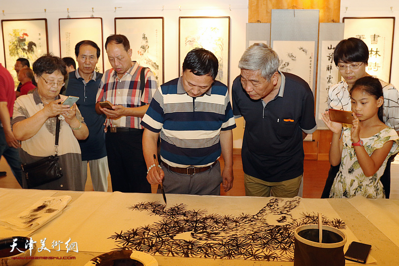 万镜明、李桂强、王书平、史振岭、何东、潘津生、张福有、高天武等在画展现场观看画作。