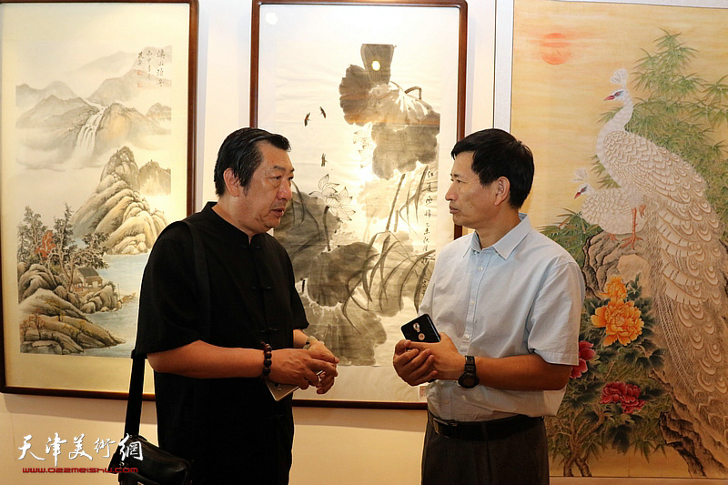 万镜明、白凤祥、李桂强、王书平在画展现场交谈。
