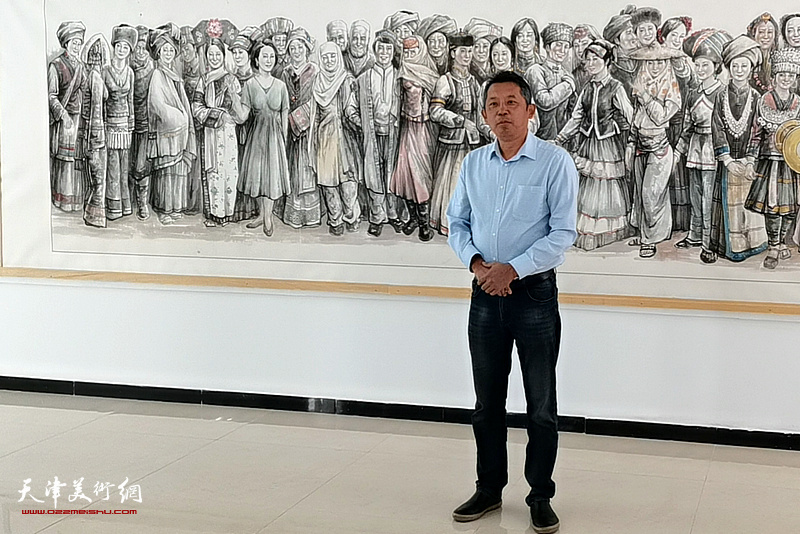 王印强陪同嘉宾观赏展出的作品。
