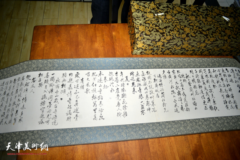 萧惠珠、哈铭、李文祥、哈敏一起观赏哈珮先生《怀馨阁吟草》卷轴真迹。