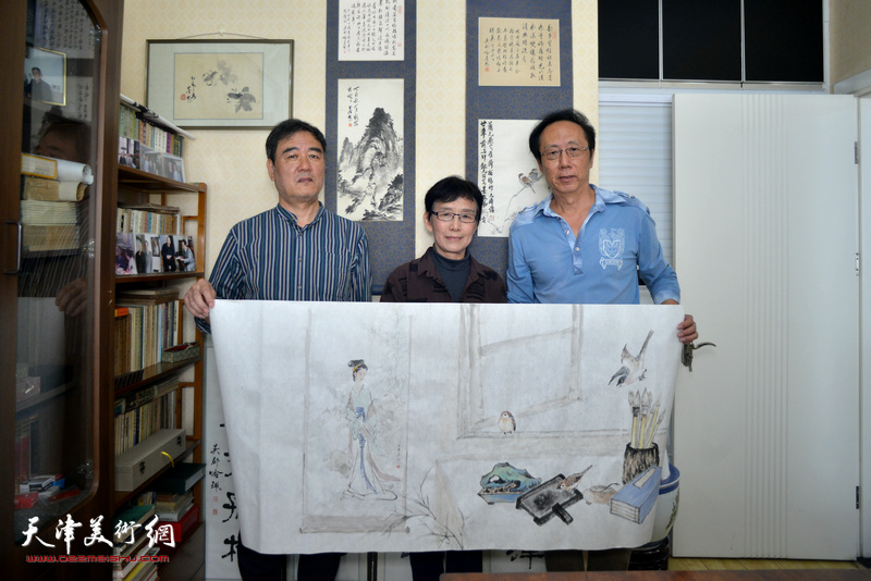 萧惠珠、哈铭、李文祥观赏哈珮先生作品。