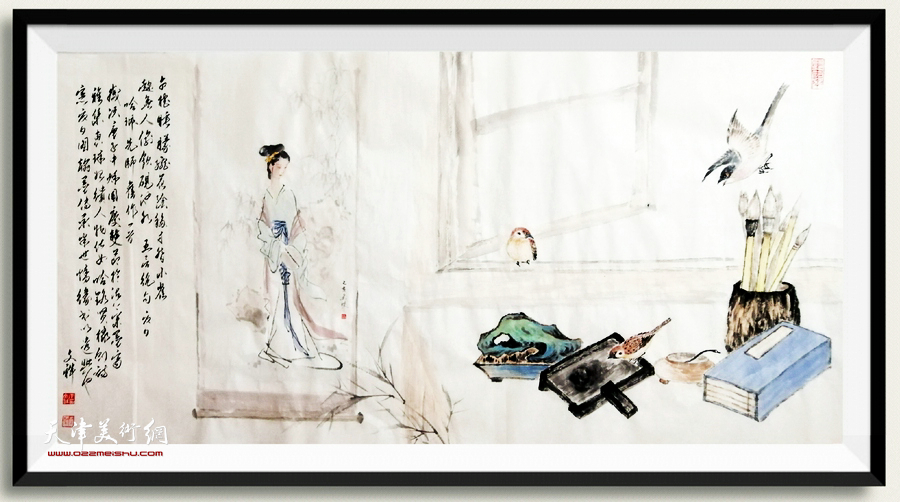 哈铭老师此次来家中以该诗为主题创作了一幅夏日图,紧扣诗意,栩栩如生,留一空白处请惠珠大姐补画轴一幅可谓妙哉。仕女青罗小扇,纤腰玉带,回眸凝思,令人忘餐。 (李文祥 文/ 包仲川 摄影)