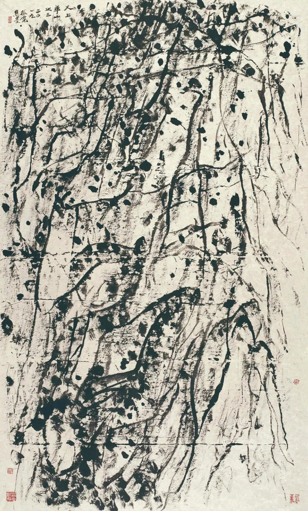 艺术家王璜生介绍了自己的参展作品:“我这次展出的两件作品都是我2019年创作的。我在20岁左右时写过一些诗词,后来找出来写在纸上。我练习着反复去书写,像日课一样,然后思考为什么不将它变成一件作品呢?中国古代绘画很讲究这种日课,每天都在干一件事或者练习修心养性。我当年写诗词,还有包括现在的书法,这种涂来涂去的过程,其实也是修养的方式。用这种方式写出来可能会留下很多痕迹,是一些有特殊的意味的东西。我将书法的混乱以及线条构成了画面,试图打破我们传统上对书法的理解以及对绘画的理解,让书法与绘画水墨融合在一起。”