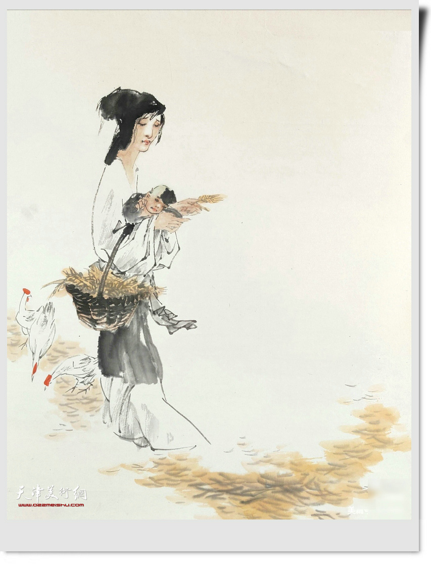 王金厚《观刈麦》作品:复有贫妇人,抱子在其旁,右手秉遗穗,左臂悬敝筐。
