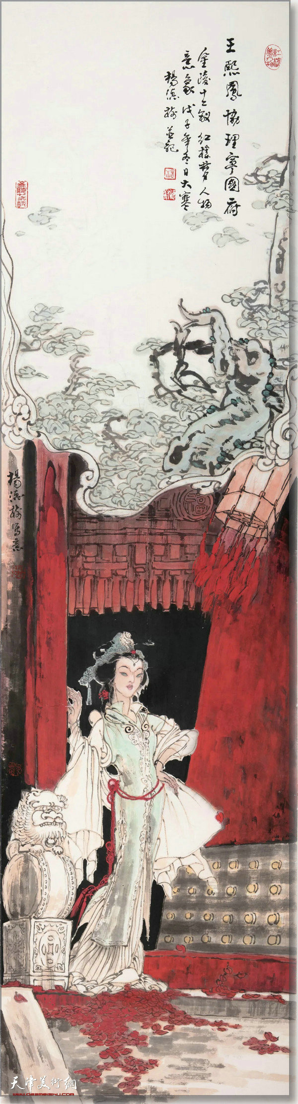 最后也最具特色的,就是,书、画、印齐聚。众所周知,杨德树先生不仅绘画了得,于书法、篆刻方面也堪称一代翘楚。当今三者兼善者已是凤毛麟角,更何况老先生在这三个领域里都拓展出了一片具有鲜明特点的疆域。在“金陵十二钗”这套组画中,长长的题跋显露出画家苍劲老辣的笔线,还有一方方形质各异、果敢畅达的印章,殊途同归,再度将“金陵十二钗”的画境推向了一个新高度。