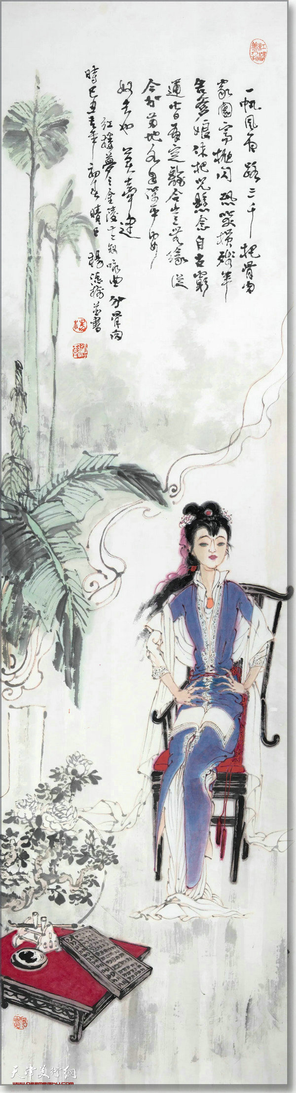 首先,人物造型独特别致、不落窠臼。纵观既有画作,许多人在形象设计上尽管绞尽脑汁,但基本都带有改琦、费晓楼、王叔晖等人的痕迹。但是杨先生独辟蹊径,不向明清及近现代前辈“讨生活”,而是上溯古人,将唐代人物画乃至元代壁画中的人物造型特点融为一体,形成了我们所见到的一个个焕然一新的仕女形象。尤其要注意的是,这种综合能力是那样圆熟精湛,显示出老先生深厚的功底和宽博的视野。