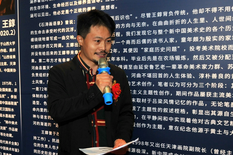 天津美术学院院长贾广健讲话说,王錞院长2020年2月离开我们,正值疫情期间,静静地走了,给我们留下无尽的哀思。今天,我们以这样一个方式怀念天津画院一位重要的老领导,他对天津画院的发展、建设,在一个时期做出了重要的贡献。他是一位非常有见地、工作非常认真的人,又是一位辛勤耕耘、勇于探索的艺术家,以艺术家的身份,在艺术创作上做出了很大成绩。今天展出的这些作品,我看了一下,基本是上世纪九十年代中期创作的,可以看到改革开放以来中国画发展的一个脉络。他对晋西北乡情风韵恋歌式地描绘,是他由衷地对曾养育了他的艺术灵性而对已然失落的生态田园之梦的追忆怀念,发出他对包括着自身在内的精神认同、寄望和某种缺失馈乏的感悟。从王老师这些作品可以看到那个时期,他既是改革开放的亲历者,又处在当代中国画发展的变革期,他做出的思考和尝试,都是我们的宝贵财富,值得探讨和研究。现在回过头来看,将近30年了,这些作品还是带着浓厚的乡土气息,非常有活力、非常有温度,让人感觉是他自己的经历、感受,转换成笔墨呈现出来。将近30年的沉积,今天以这样一个方式,和大家见面,好像我们也感受到王老师的生命通过这些作品,依然在延续,也看出这些非常有探索性的作品,逐渐显现出它独特的艺术价值。今天我们睹画思人,是对王錞院长为天津画院和天津美术事业做出的贡献的缅怀,也是对他的肯定和敬仰。