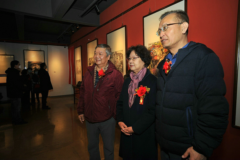 贾广健、王爱宗、张大玮观赏展出的王錞先生作品。