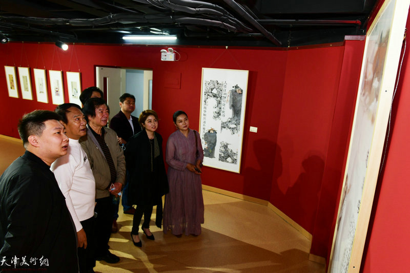 马寒松、赵红云、宋鹏、房志鹏、郭颜波观赏展出的画作。