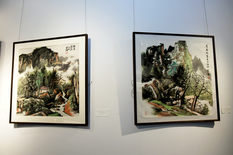 来宾在画展现场观赏展出的作品。