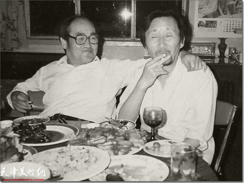 时光流转,徜徉于往昔,忆起那时每逢周日半天课程,从小学回家,推开门来——一定是父亲和众学生或与书画圈知交五、七人在家里饮宴论艺,把酒畅谈,每每至晚方散……当年的父亲,除在美术学校任教还致力于面向社会的艺术教育,参与创建中国书画报、天津业余书画学院及东方艺术学院等并教授主要课程,同期仍会率领美校学生写生於南北各地,登峰临泽撷写山川草木……