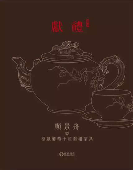 顾景舟大师为紫砂艺术做出重大的贡献,从秋拍这套巨制‘松鼠葡萄十头套组茶具’,我们能一睹顾老建国之初制壶风采。作品诞生于1955年,当时正值不惑壮年的顾老响应政府号召,积极参与汤度陶业生产合作社紫砂生产工厂的筹建工作,不仅着手负责‘紫砂工艺班’的招生和技术辅导,还制作出这套体量恢宏的花器巨制。顾景舟大师一生的创作绝大多数为光素器,此套作品尤为珍稀,不仅造型饱满浑厚,壶盖、壶把及流的枝干制作得也颇有气势,松鼠葡萄纹饰生意盎然,布局有章,一气呵成又不乏自然之趣,实为当年精工细制,苦思经营的成果。且十头成套,从造型、贴塑均可看出一丝不苟,精益求精,不难想象当年顾老为此套作品倾注的精力与心血,形制巨大,又是目前所见之孤品,堪称顾老花器的巅峰巨作。