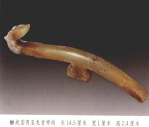 到了战国中、晚期,玉带钩的制作与使用迅速发展,这一时期的玉带钩出土数量多、分布范围广、制作工艺精,其形制、长度、纹饰较前有了很大变化,但由钩首、钩体、钩钮组成的完备形态已经定型,时代特征较为明显。体形较小的水禽形玉带钩依然沿用,但头小,颈部变细,腹面为素面或上刻细阴线纹,腹背面置钮,钮顶端大而圆。另一类常见的细长曲棒形玉带钩,体长而扁宽,有的腹部呈扁柱状,钩首多为龙首形,龙首刻琢简约,嘴短宽,圆眼外凸,仅见轮廓,腹面为素面或上刻几何、兽面纹,钮端部多方扁状,宽度约等同钩身。还有一类短宽形带钩也较流行,此类器钩首略呈方形,颈腹部同宽,多素面,有的在钩首或腹面刻有凸起的弦纹。这一时期玉带钩钩钮继续远离钩尾而向体中央移动,多数位于距钩尾四分之一或三分之一处,个别已移至钩体中部位置。带钩长度超过10厘米的已屡见不鲜,也有个别长度超过20厘米的。