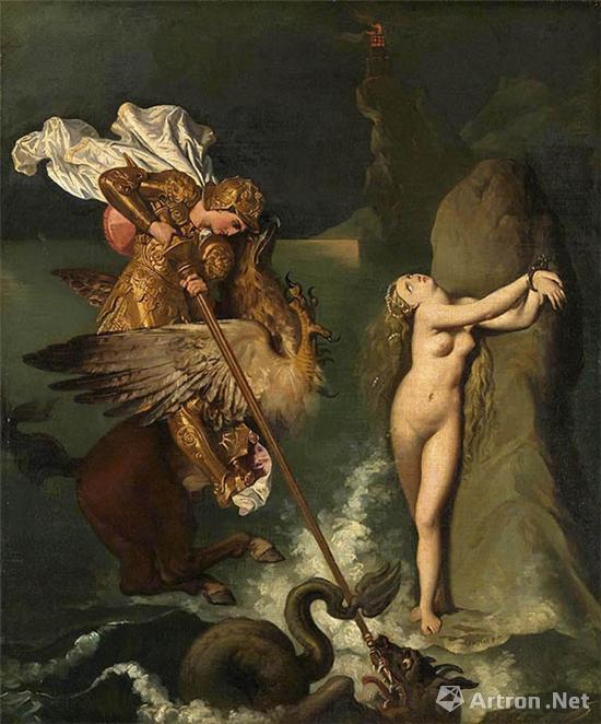 展览中有幅安格尔的油画《鲁杰罗拯救安吉利卡》(Angelica Saved by Ruggiero),是德加最心爱之物。画题取自16世纪意大利诗人阿里奥斯托(Ludovico Ariosto)名篇中英雄屠龙救美的情节,安格尔以此在1819年为卢浮宫画了一幅大画,但也许是这个宏阔场面的文学题材同时可以让他展示在绘画女性裸体方面的卓绝,后来他接连又画过几幅同题。德加拥有过的这幅,曾经属于安格尔密友弗雷德里克·雷塞(Frederic Reiset)的私藏,此人做过卢浮宫素描馆和绘画馆负责人,是名望极高的一位学者,去世后收藏被拍卖,德加不计代价地拍得了这幅久慕的画作。出于对安格尔和这个画题的景慕,德加后来又设法购藏了一幅构图完全相同的安格尔素描,现在哈佛大学博物馆收藏。在艺术史上,德加的舞女被认为和安格尔伟大的素描有一种承接关系,看来也是有据可循。